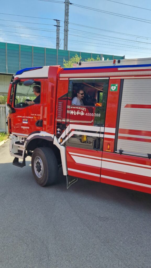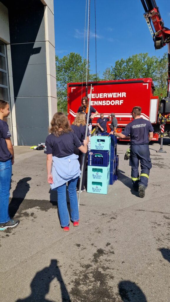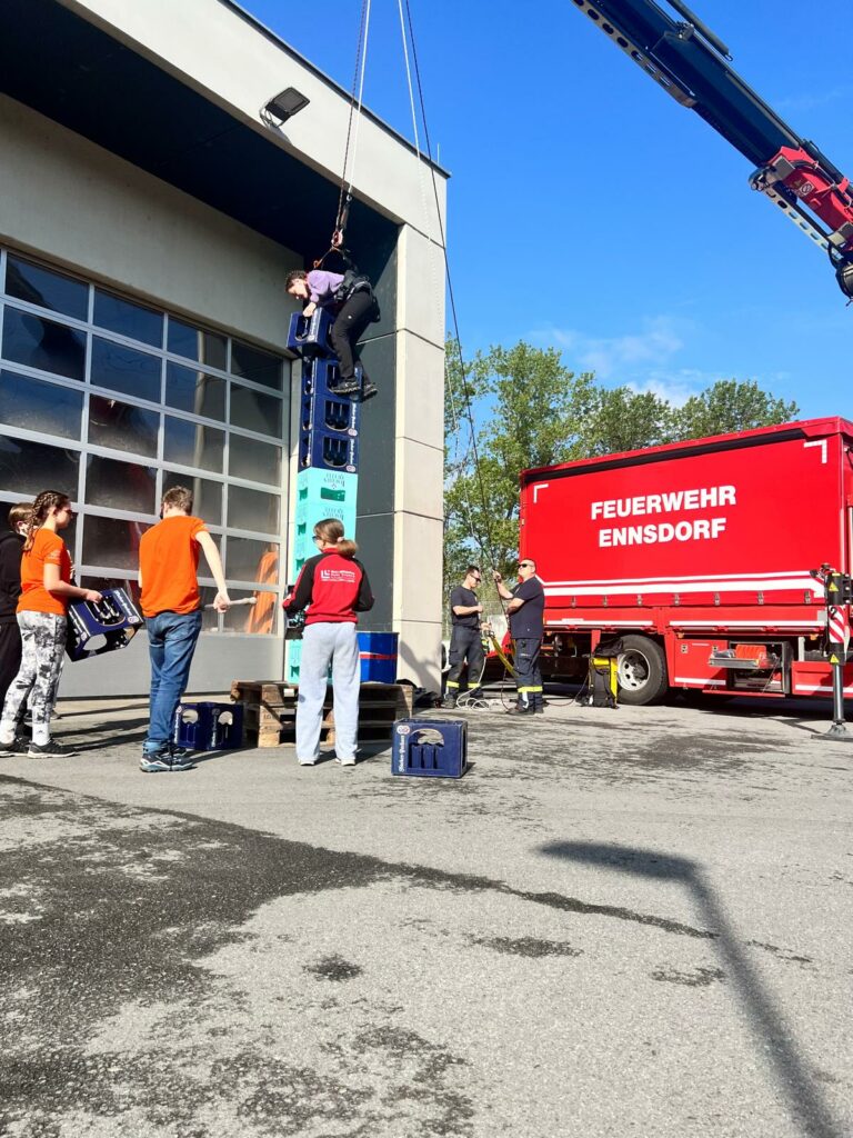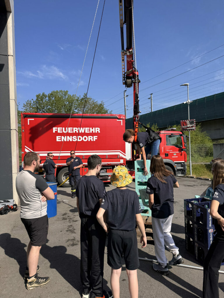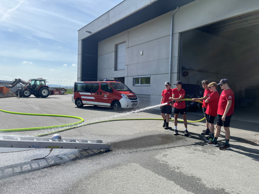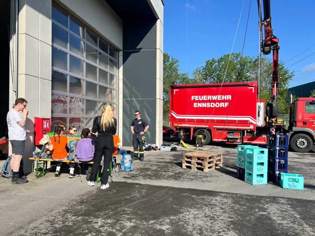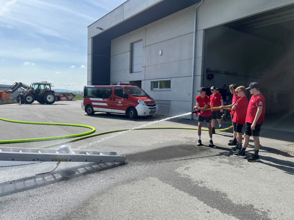 Bei der Freiwilligen Feuerwehr Ennsdorf konnten sie sich im Kistenklettern und Ballspritzen unter Beweis stellen. Dafür durften sie dann im Feuerwehrauto mitfahren: