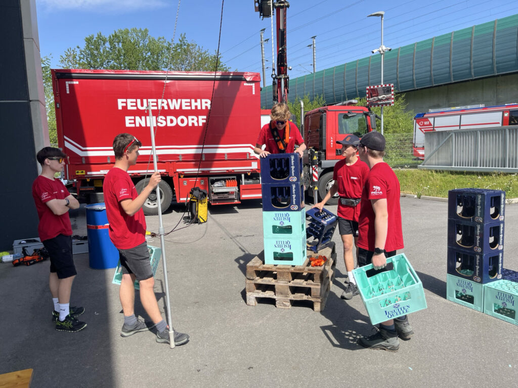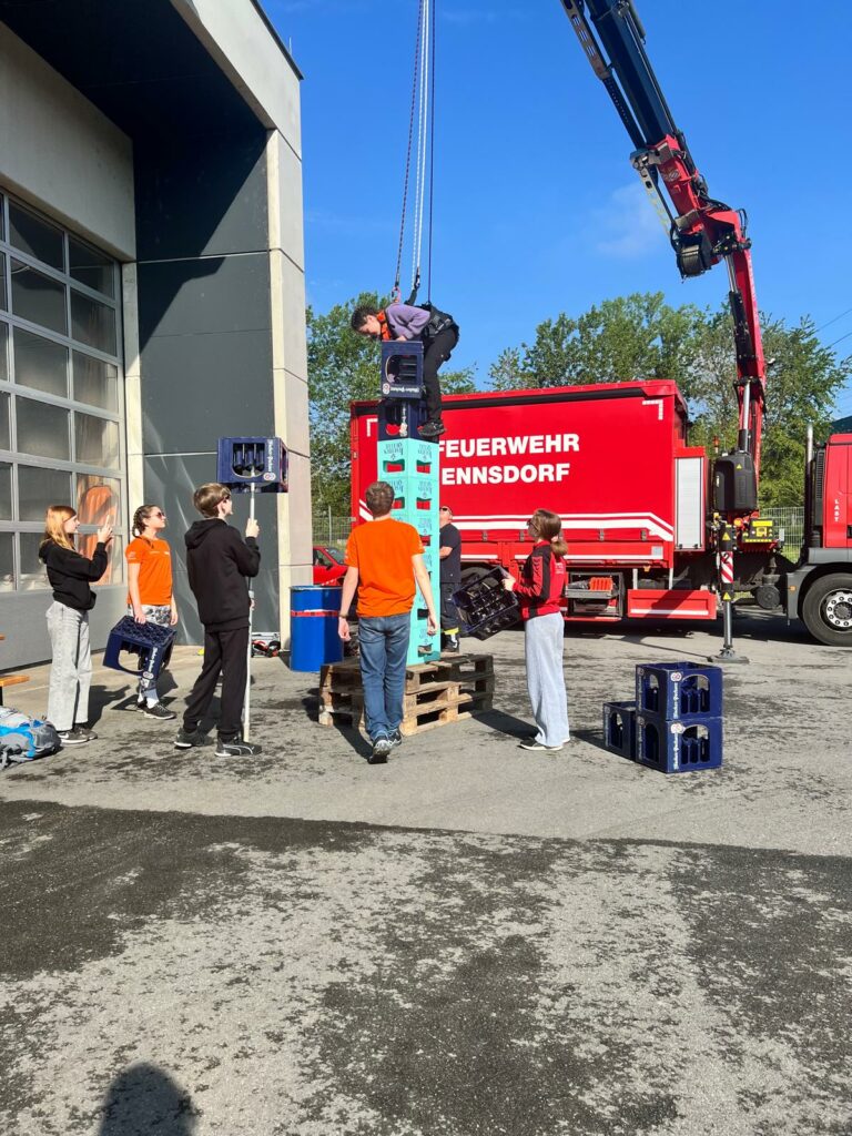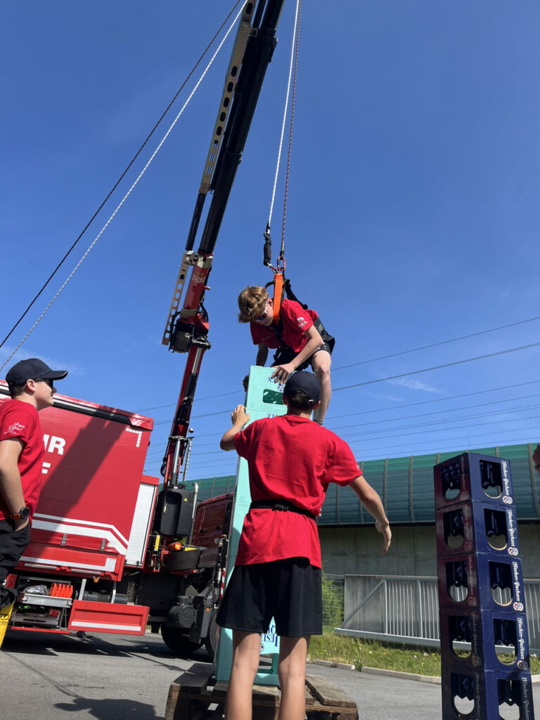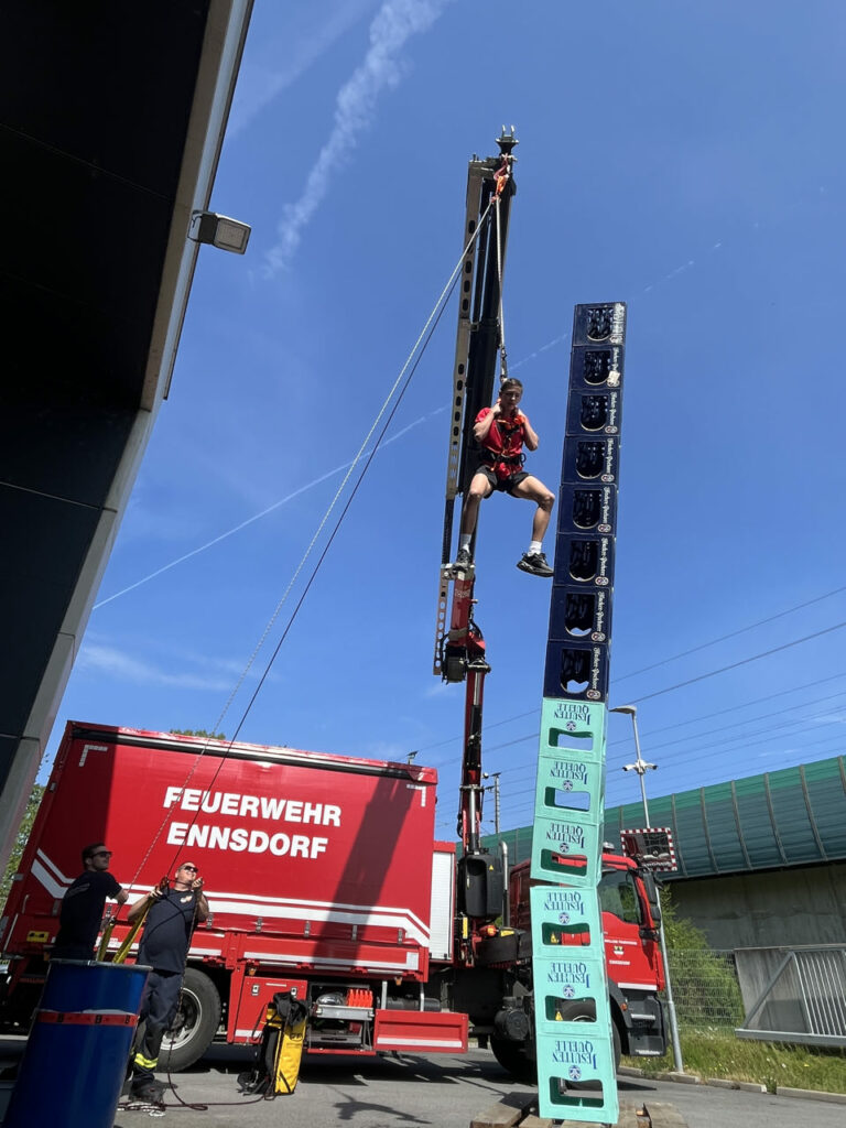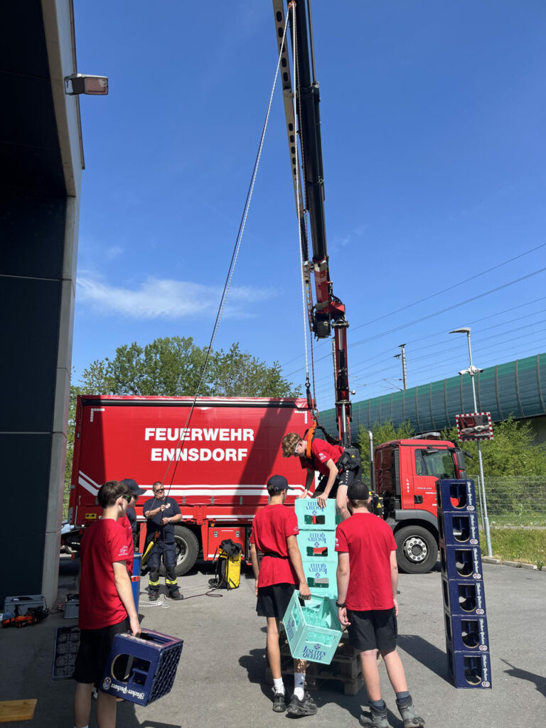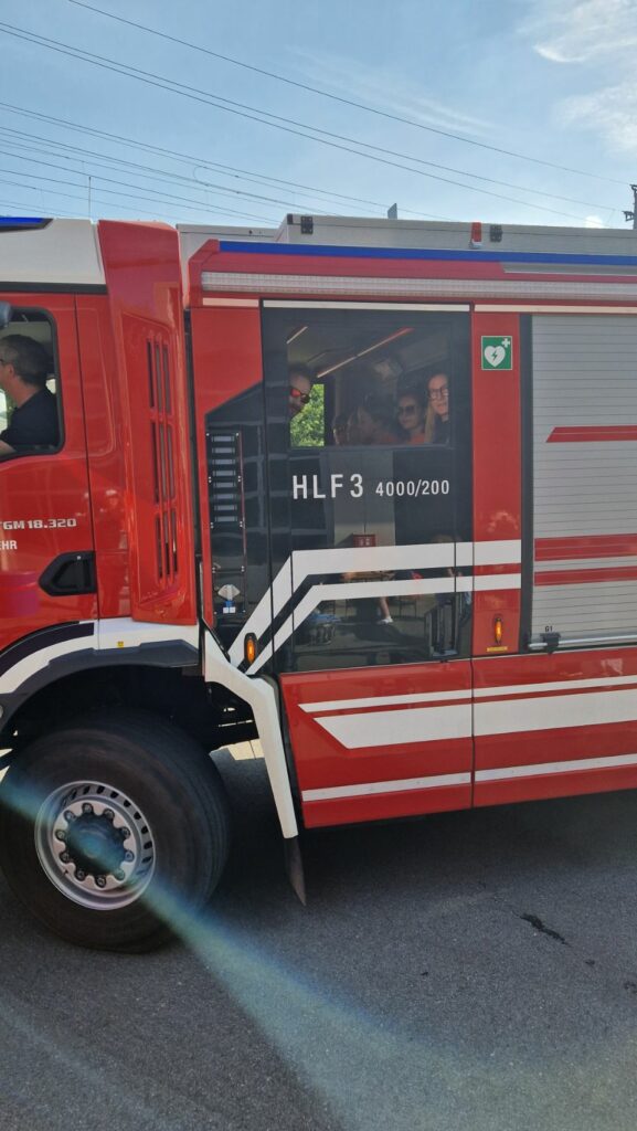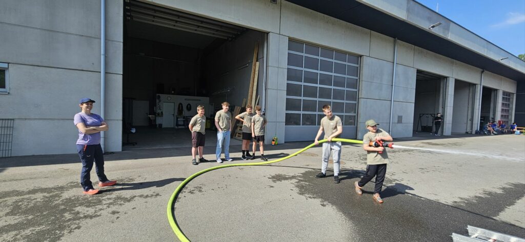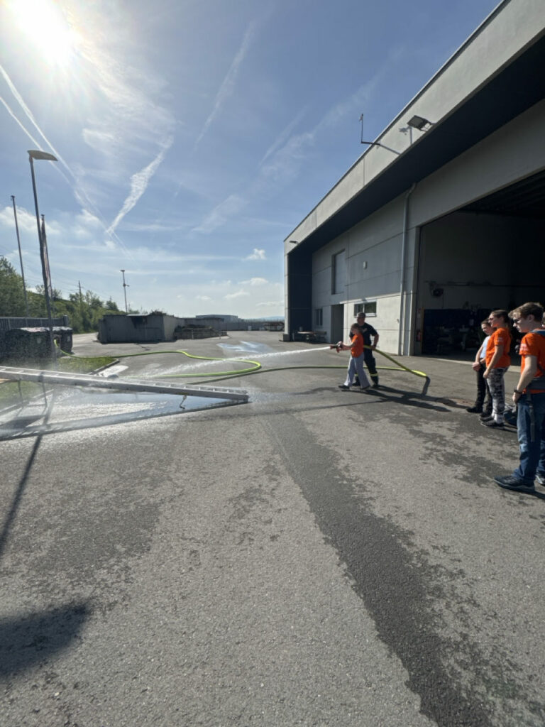 Bei der Freiwilligen Feuerwehr Ennsdorf konnten sie sich im Kistenklettern und Ballspritzen unter Beweis stellen. Dafür durften sie dann im Feuerwehrauto mitfahren: